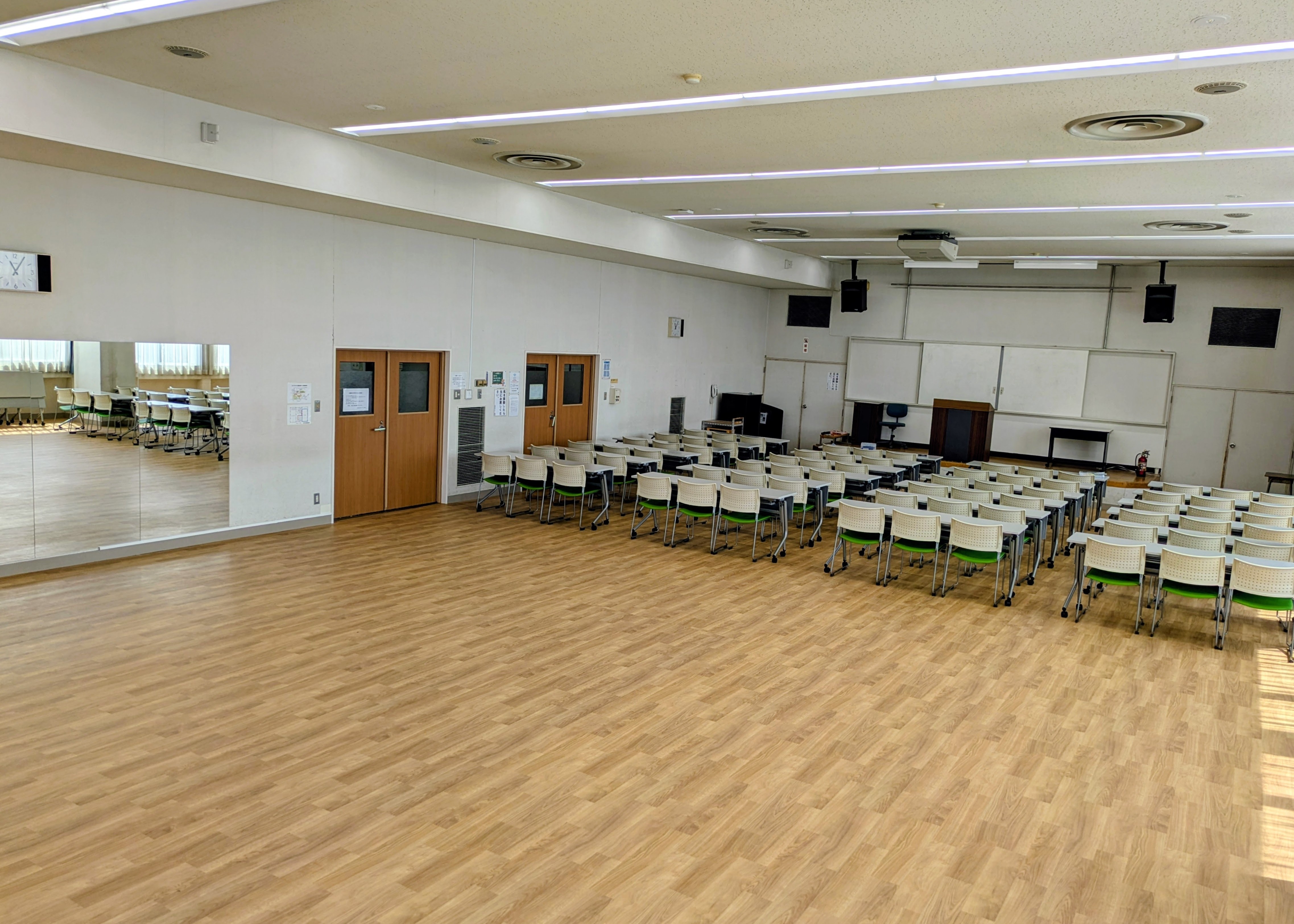 会議利用の方で前側だけでは足りない場合は、お手数ですが、室内に収納してある机・椅子(最大72名分)を必要分だけ移動してお使いいただき、使用時間内にまた元に戻していただくようお願いいたします。
