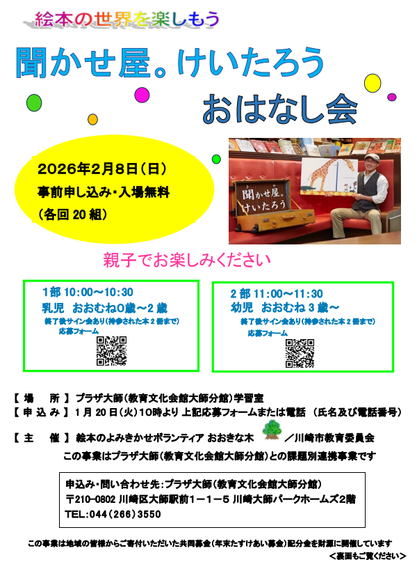 「絵本の世界を楽しもう:絵本作家 聞かせ屋。けいたろう さんのおはなし会と講演会」 紹介写真1